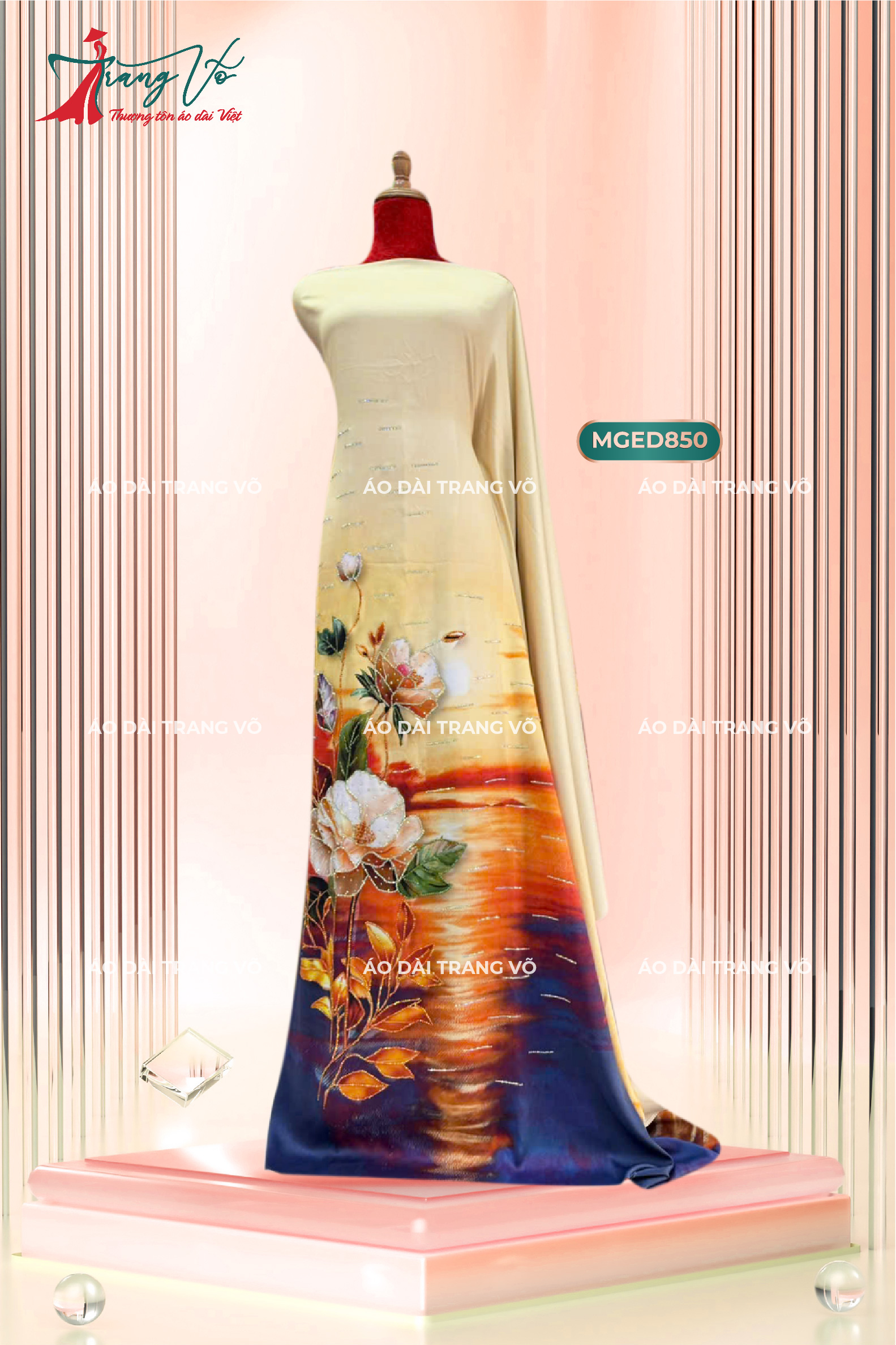 Áo dài được ép đá tinh xảo và đầy nghệ thuật. Mỗi viên đá đều được đính tỉ mỉ, tạo chiều sâu và độ chân thực cao. Màu sắc của họa tiết được phối hài hòa, giúp áo dài có chiều sâu và nổi bật hơn khi mặc.