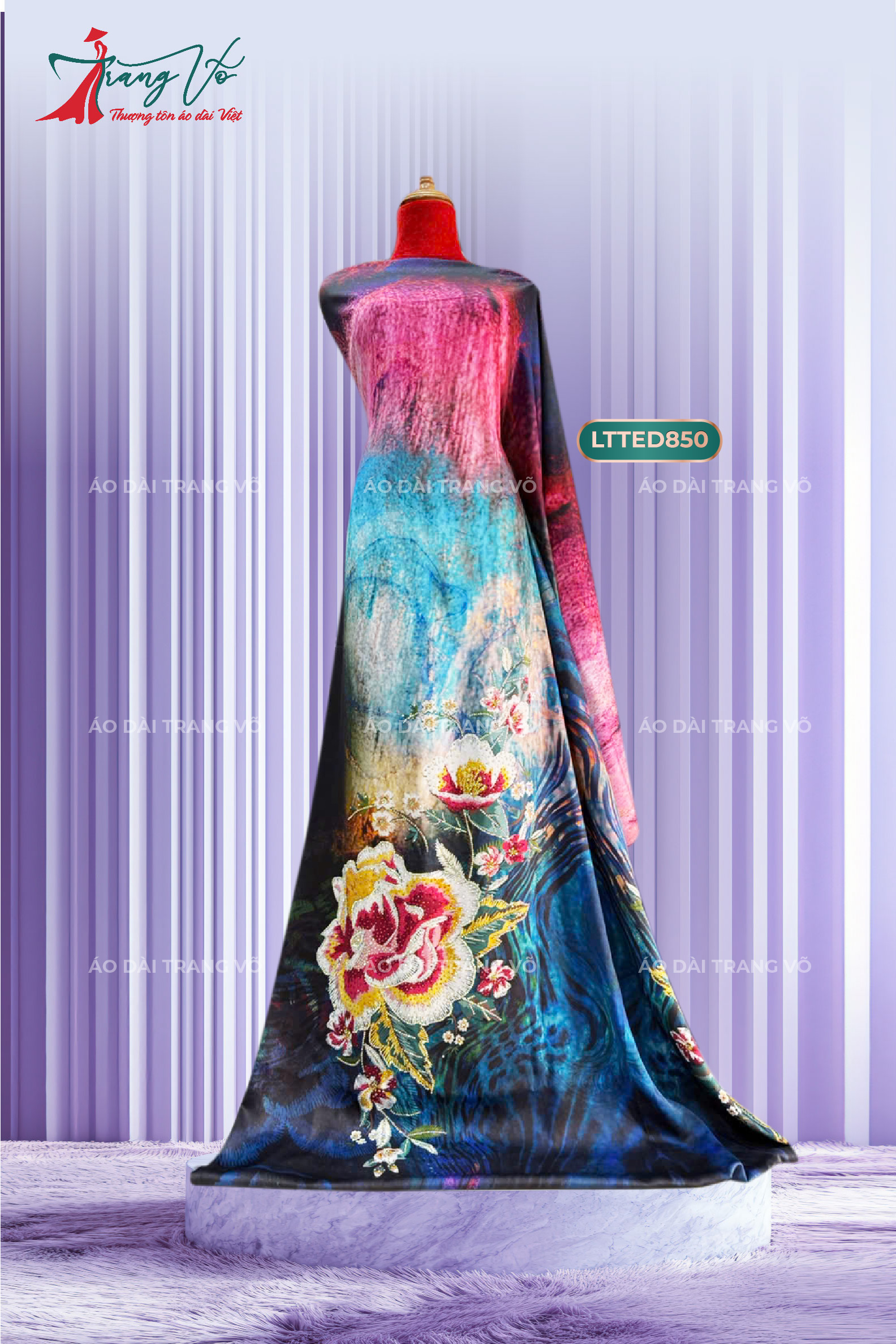 Áo dài được ép đá tinh xảo và đầy nghệ thuật. Mỗi viên đá đều được đính tỉ mỉ, tạo chiều sâu và độ chân thực cao. Màu sắc của họa tiết được phối hài hòa, giúp áo dài có chiều sâu và nổi bật hơn khi mặc.