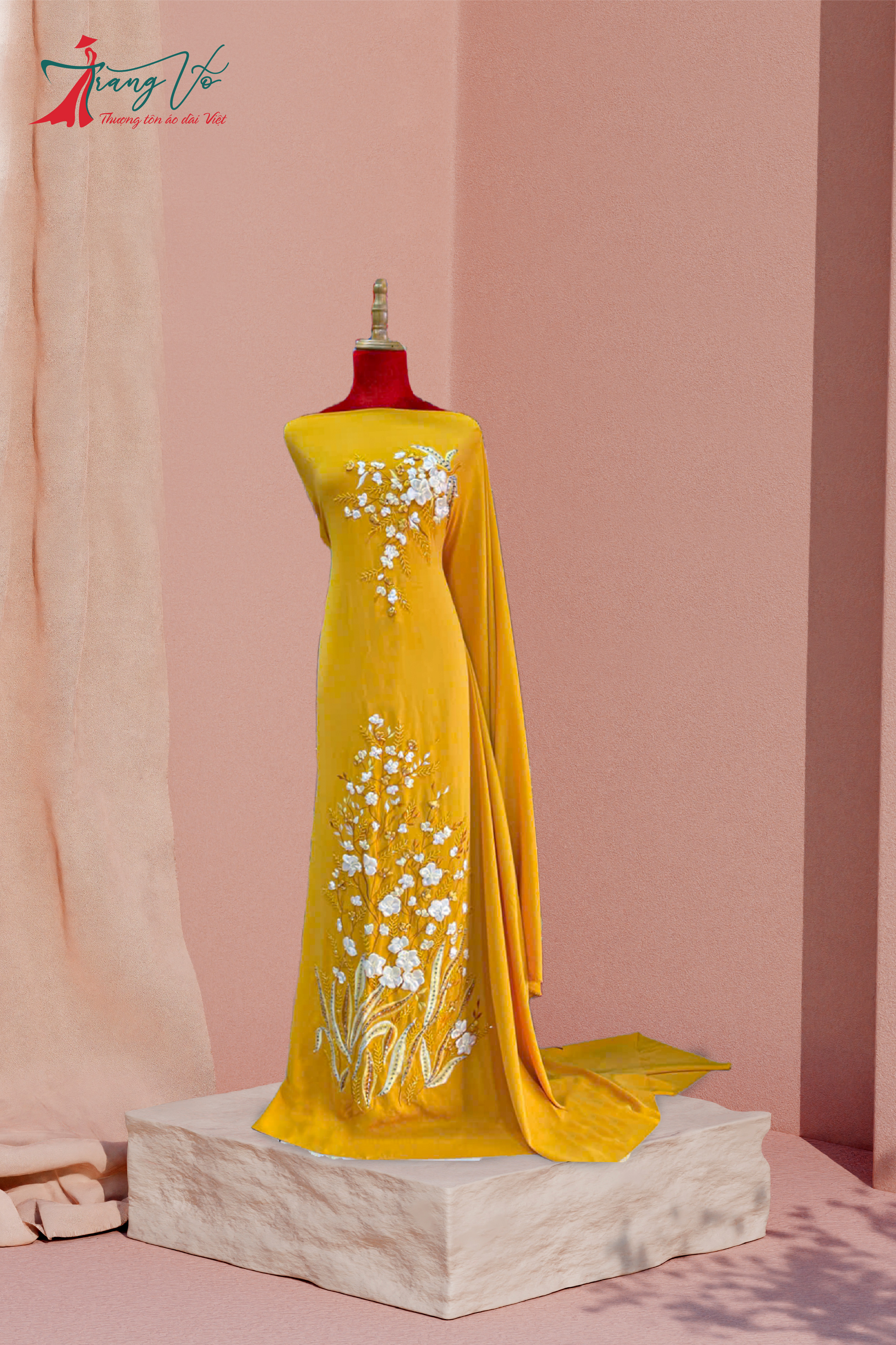 Chất liệu lụa mềm mại mang đến cảm giác nhẹ nhàng và thoải mái, kết hợp với hoa văn thêu tinh tế và ruy băng đầy màu sắc, tạo nên một vẻ đẹp vừa thanh lịch, vừa nổi bật.