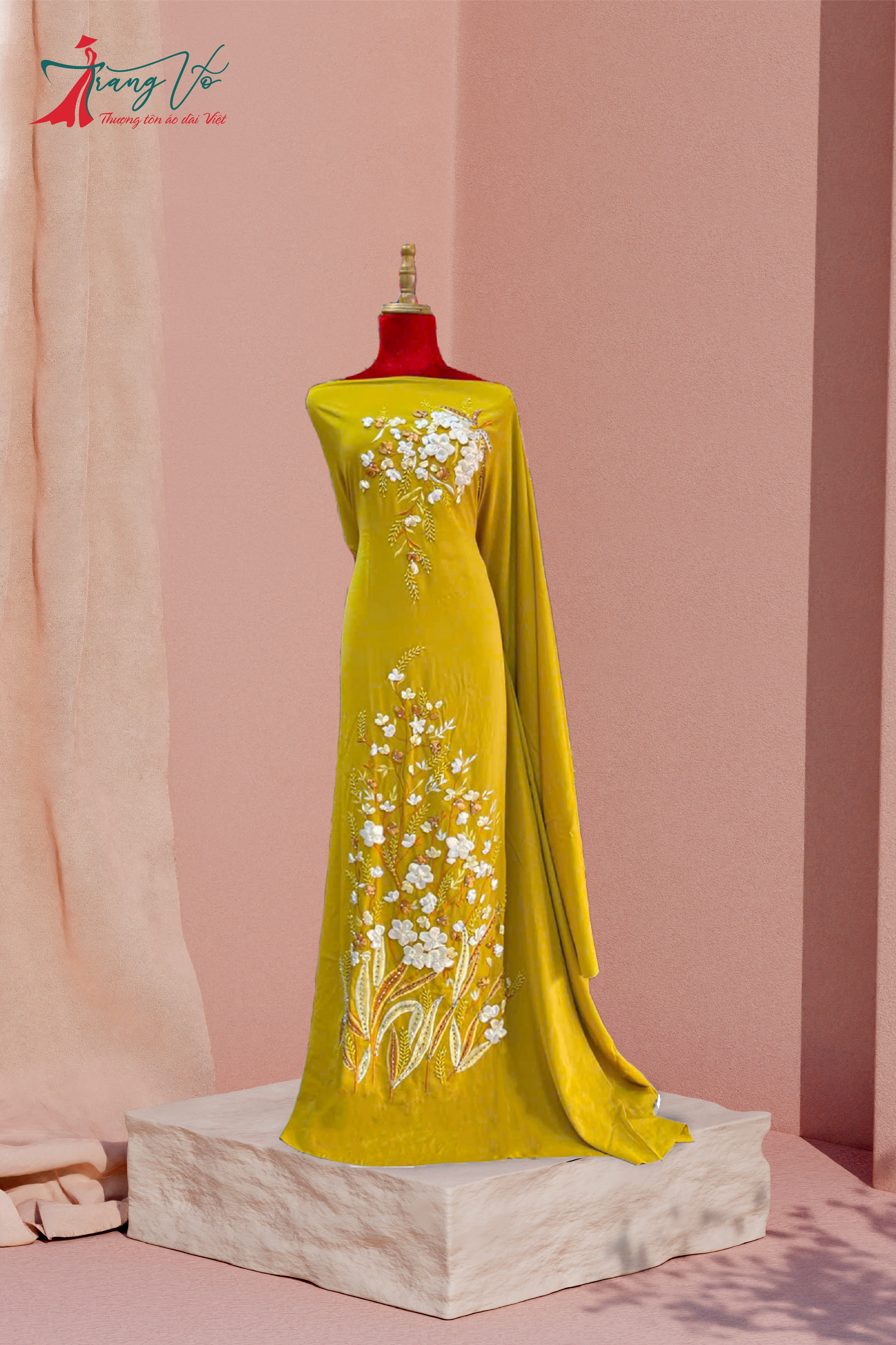 Chất liệu lụa mềm mại mang đến cảm giác nhẹ nhàng và thoải mái, kết hợp với hoa văn thêu tinh tế và ruy băng đầy màu sắc, tạo nên một vẻ đẹp vừa thanh lịch, vừa nổi bật.