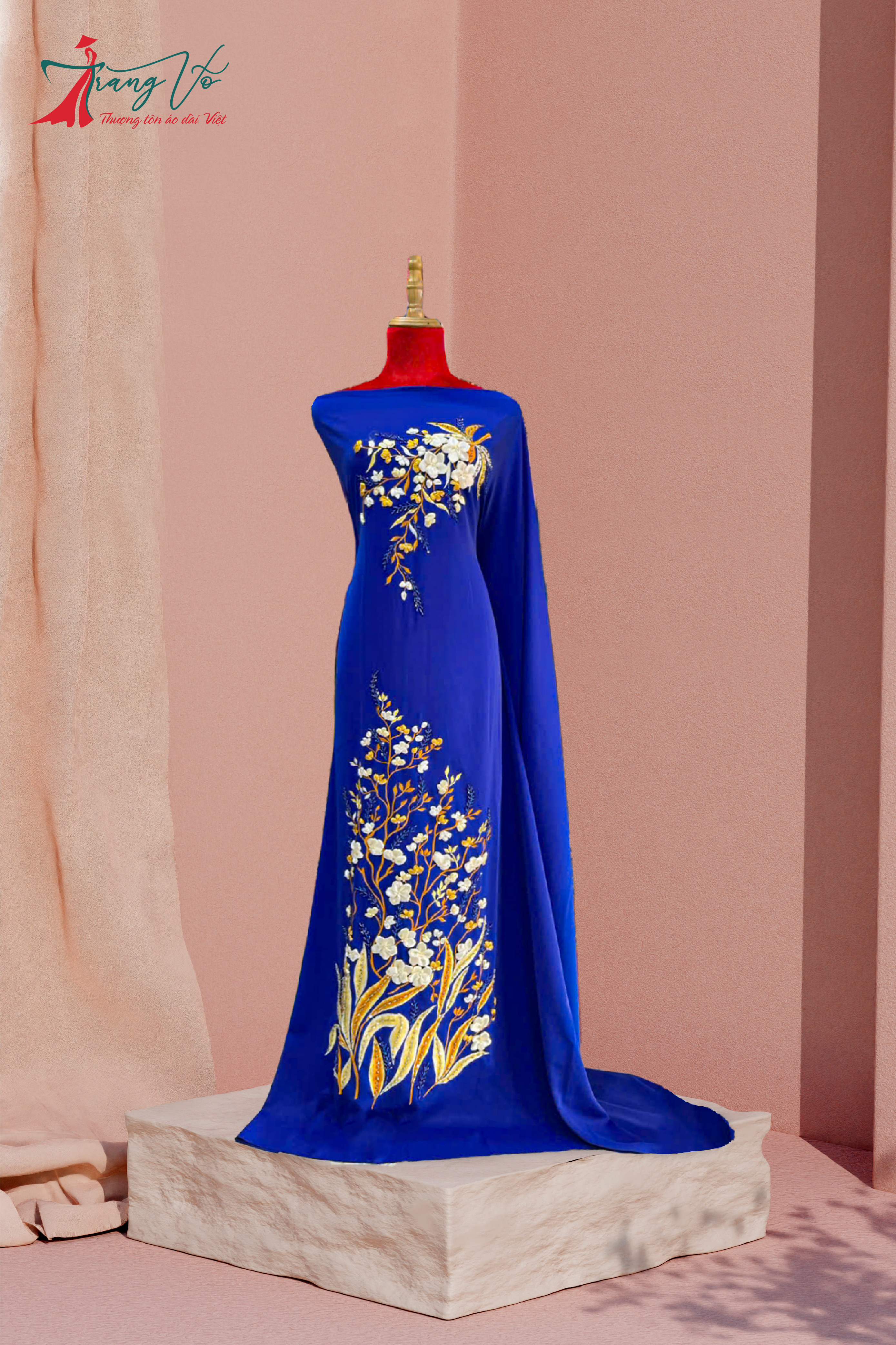 Chất liệu lụa mềm mại mang đến cảm giác nhẹ nhàng và thoải mái, kết hợp với hoa văn thêu tinh tế và ruy băng đầy màu sắc, tạo nên một vẻ đẹp vừa thanh lịch, vừa nổi bật.