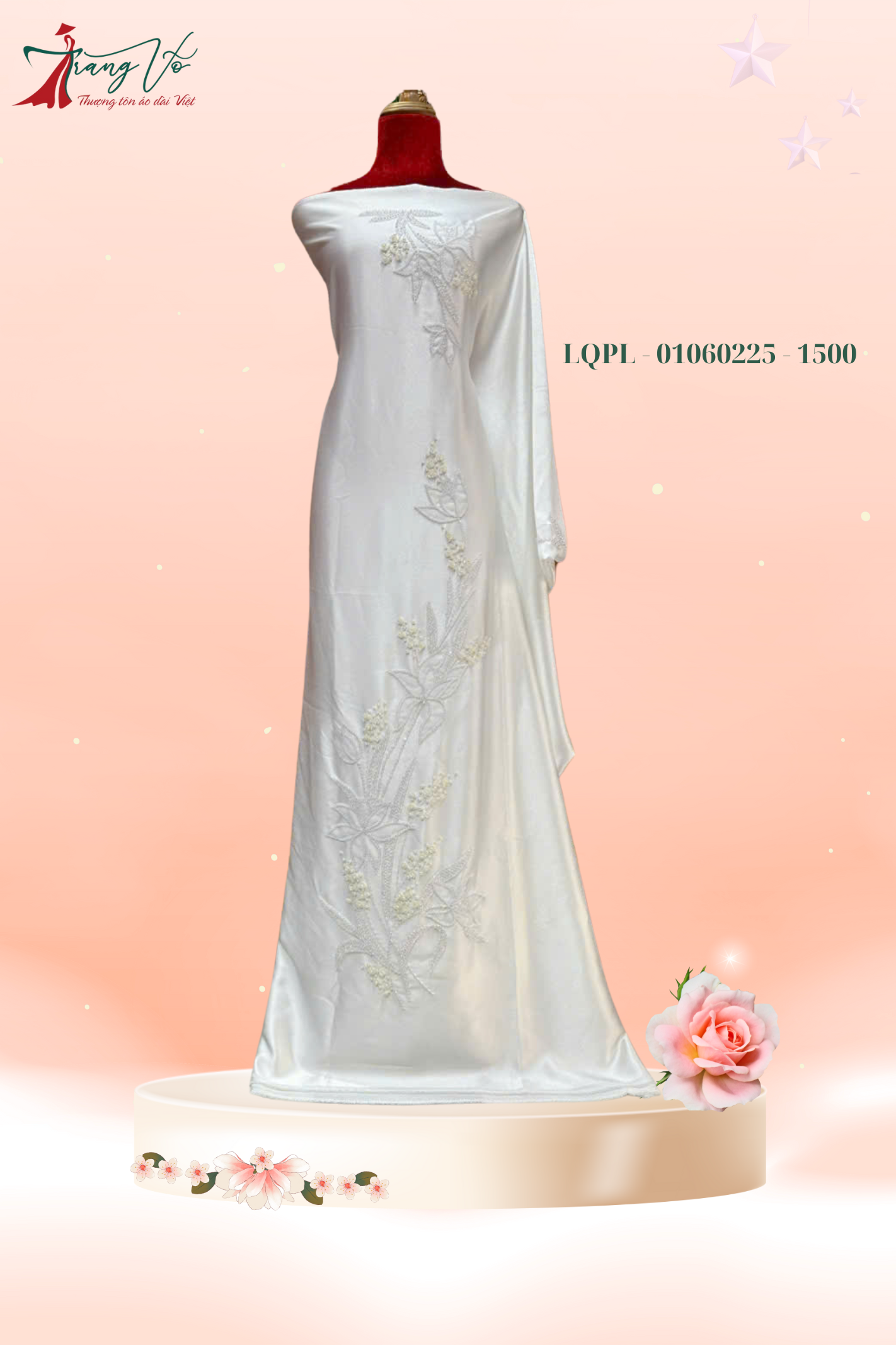 Với chất liệu Lụa Quen cao cấp và hoa văn thêu tay tinh xảo, mẫu vải này mang đến vẻ đẹp sang trọng, nổi bật với hiệu ứng pha lê lấp lánh.