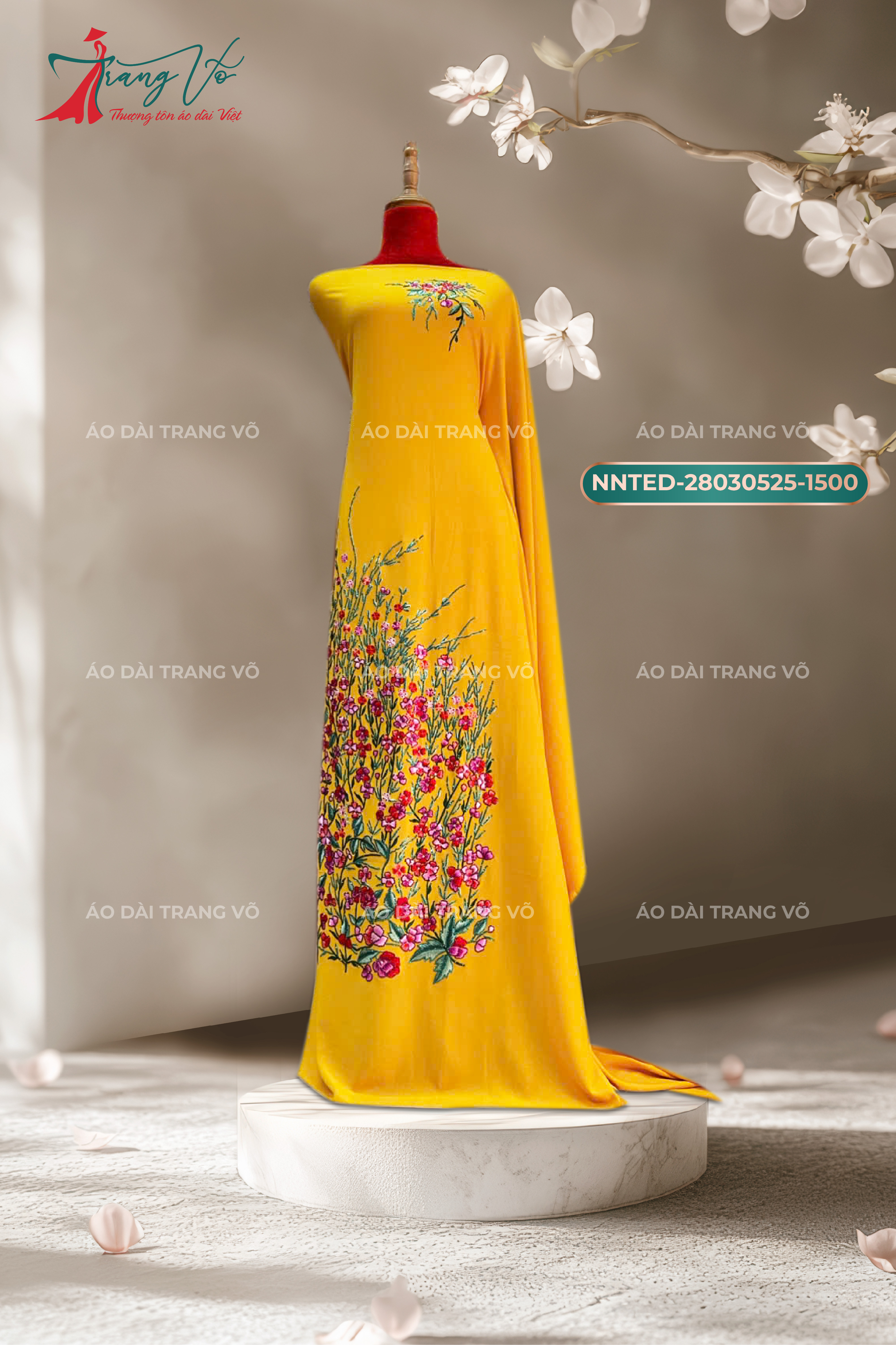 Áo dài trên nền Nhung Nhật được vẽ tay hoàn toàn, tạo nên họa tiết hoa tinh tế, sắc nét. Từng chi tiết đều được tô vẽ tỉ mỉ, giúp màu sắc lên chuẩn, có chiều sâu và độ chuyển sắc tự nhiên. Sự kết hợp giữa nhung mềm mại và họa tiết vẽ tay mang đến vẻ đẹp vừa cổ điển vừa hiện đại.