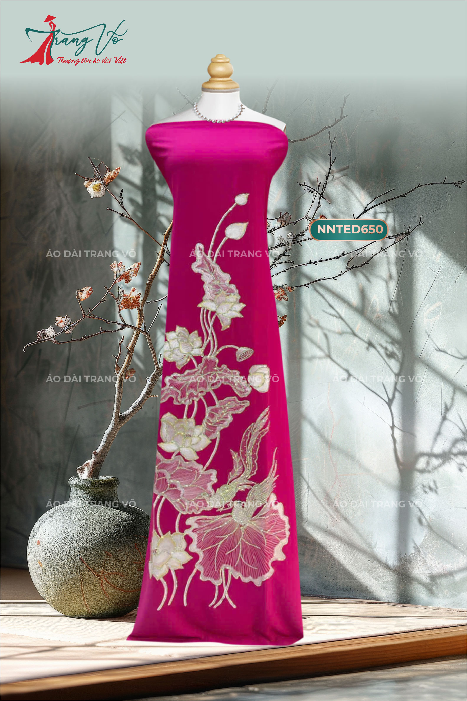 Sự kết hợp giữa chất liệu nhung cao cấp, kỹ thuật vẽ tay điêu luyện và đính kết tinh xảo tạo nên những mẫu áo dài vừa sang trọng, vừa độc đáo. Thiết kế này giúp người mặc tỏa sáng trong những sự kiện quan trọng, toát lên vẻ quý phái và đẳng cấp.