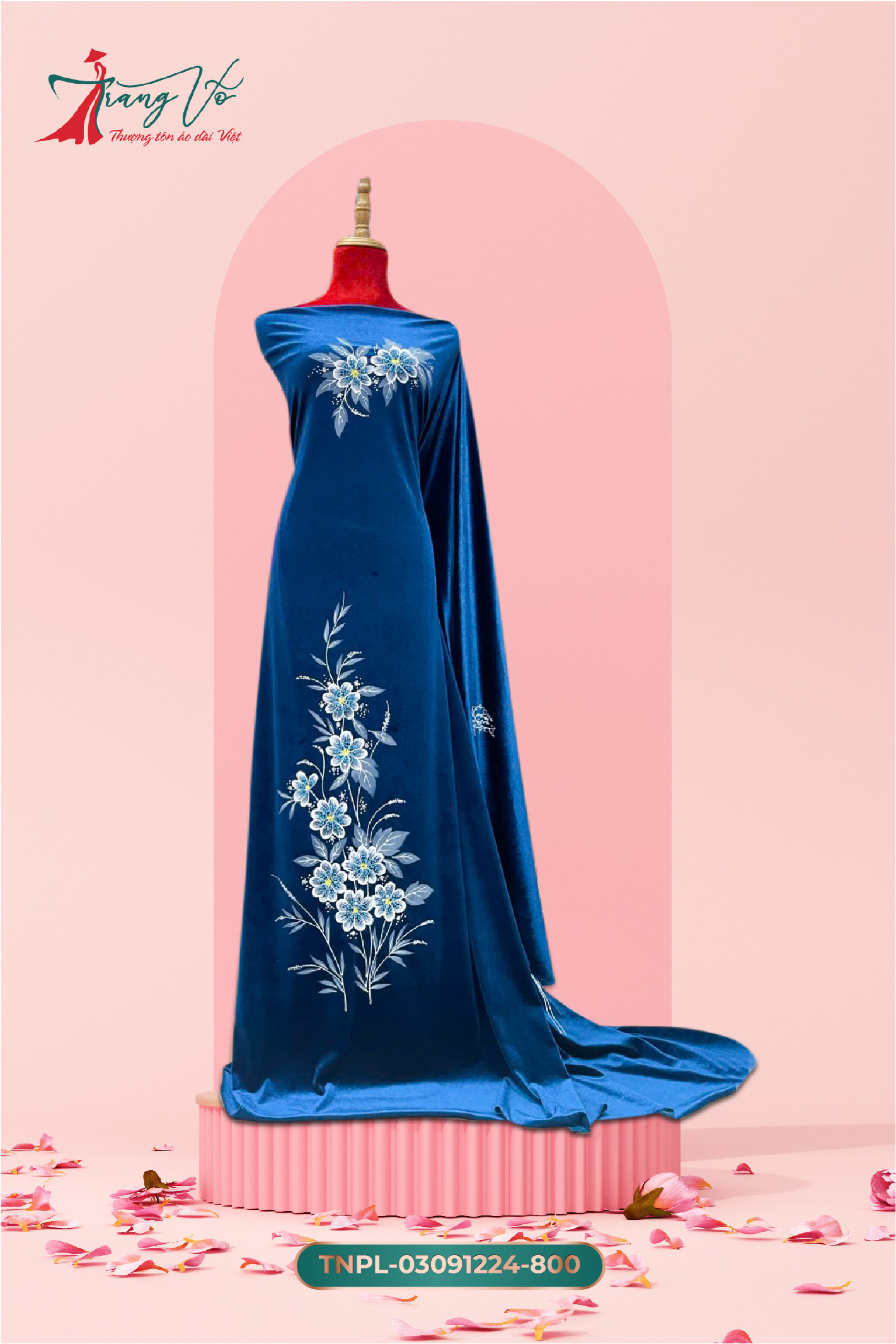Áo dài được may từ vải nhung thun mềm mại, với họa tiết vẽ tinh xảo kết hợp cùng pha lê lấp lánh, mang đến vẻ đẹp sang trọng và quý phái