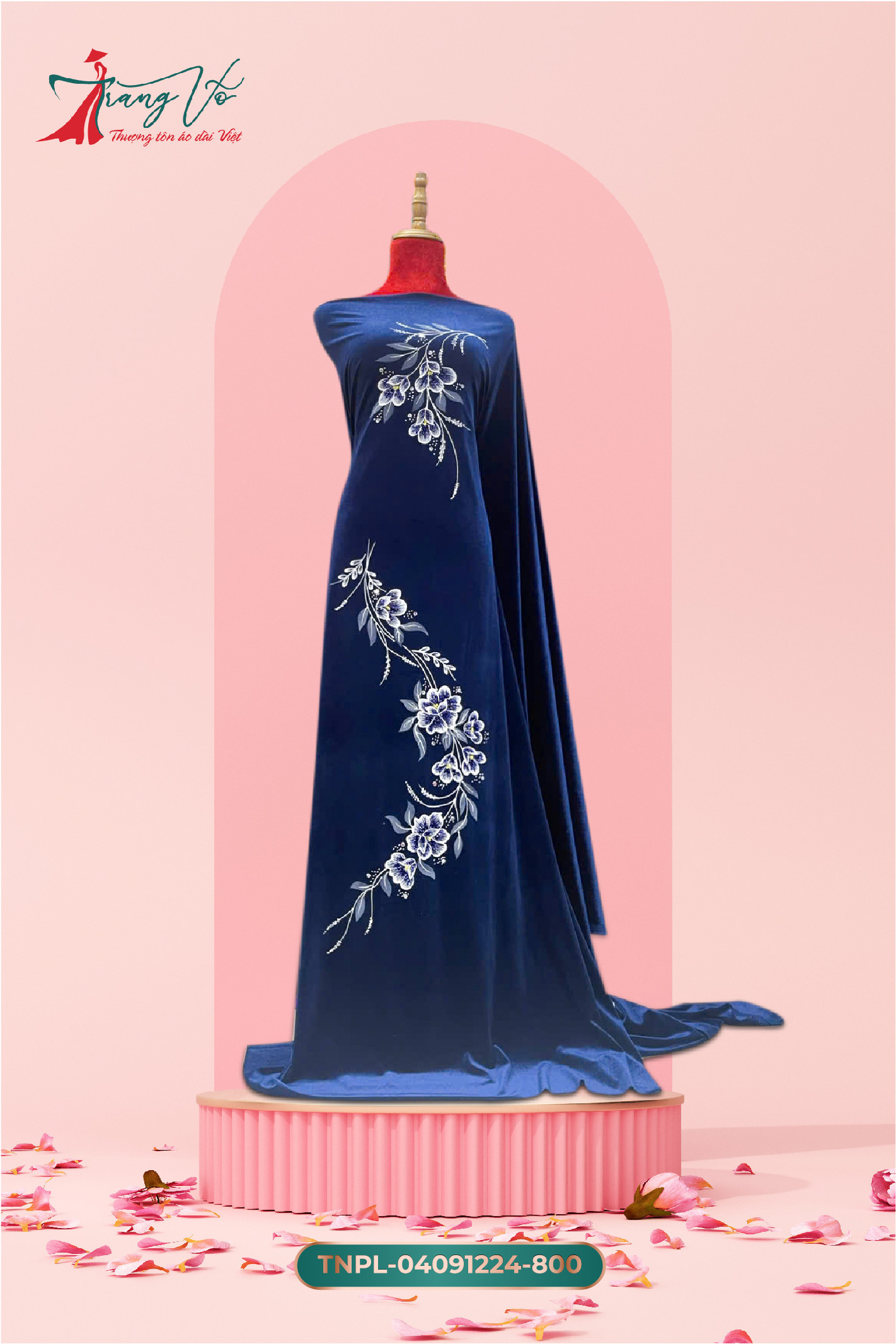 Áo dài được may từ vải nhung thun mềm mại, với họa tiết vẽ tinh xảo kết hợp cùng pha lê lấp lánh, mang đến vẻ đẹp sang trọng và quý phái