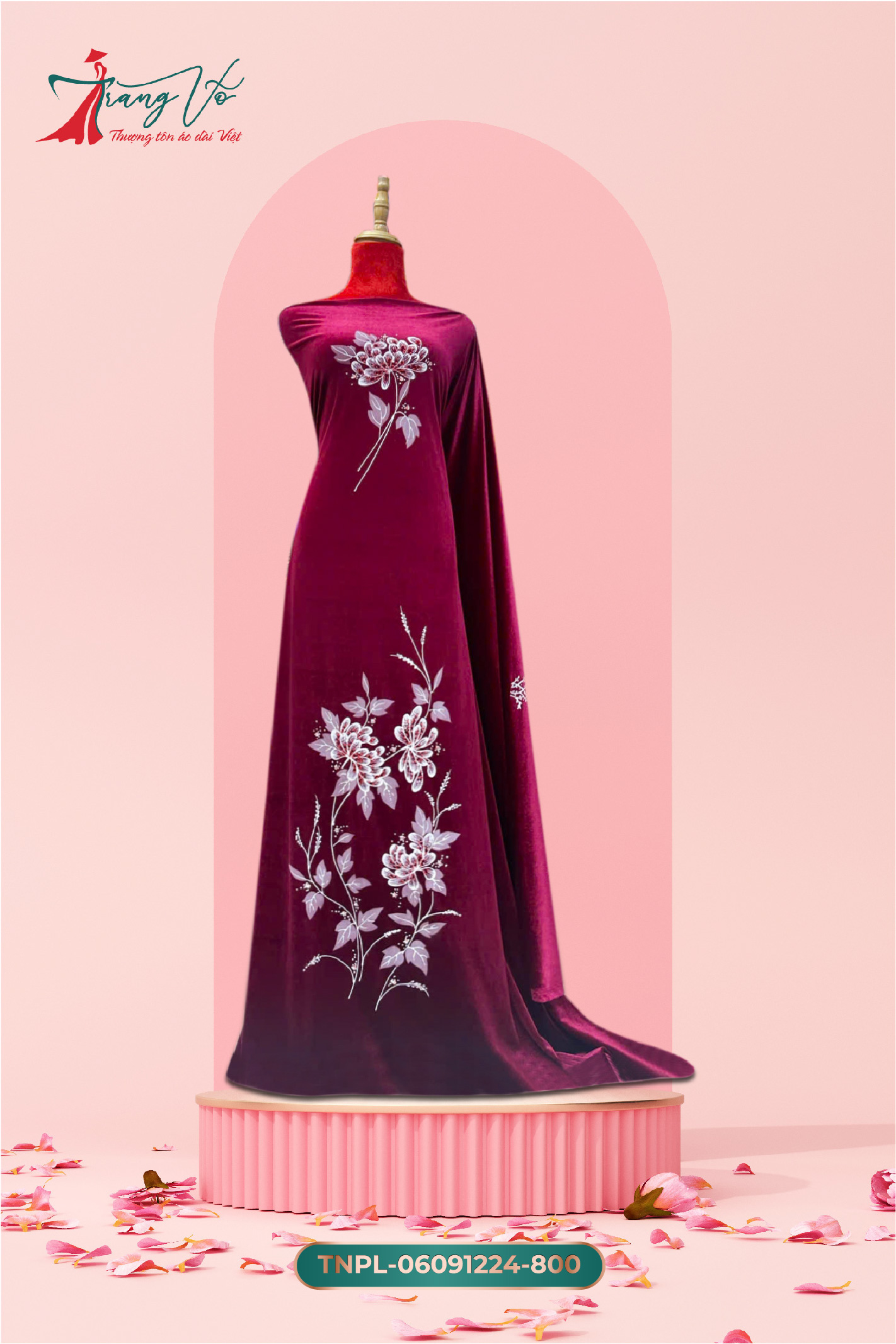 Áo dài được may từ vải nhung thun mềm mại, với họa tiết vẽ tinh xảo kết hợp cùng pha lê lấp lánh, mang đến vẻ đẹp sang trọng và quý phái