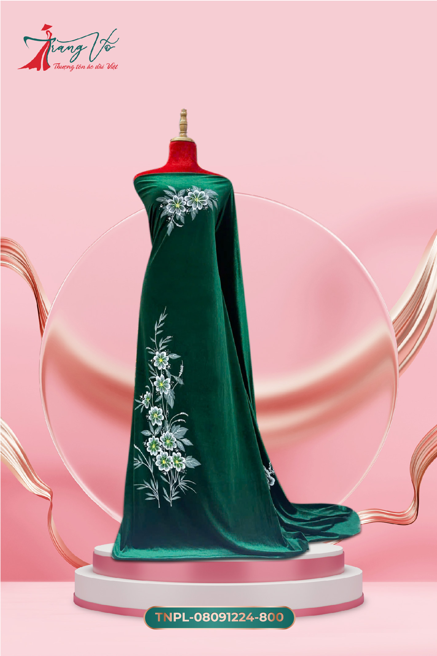 Áo dài được may từ vải nhung thun mềm mại, với họa tiết vẽ tinh xảo kết hợp cùng pha lê lấp lánh, mang đến vẻ đẹp sang trọng và quý phái