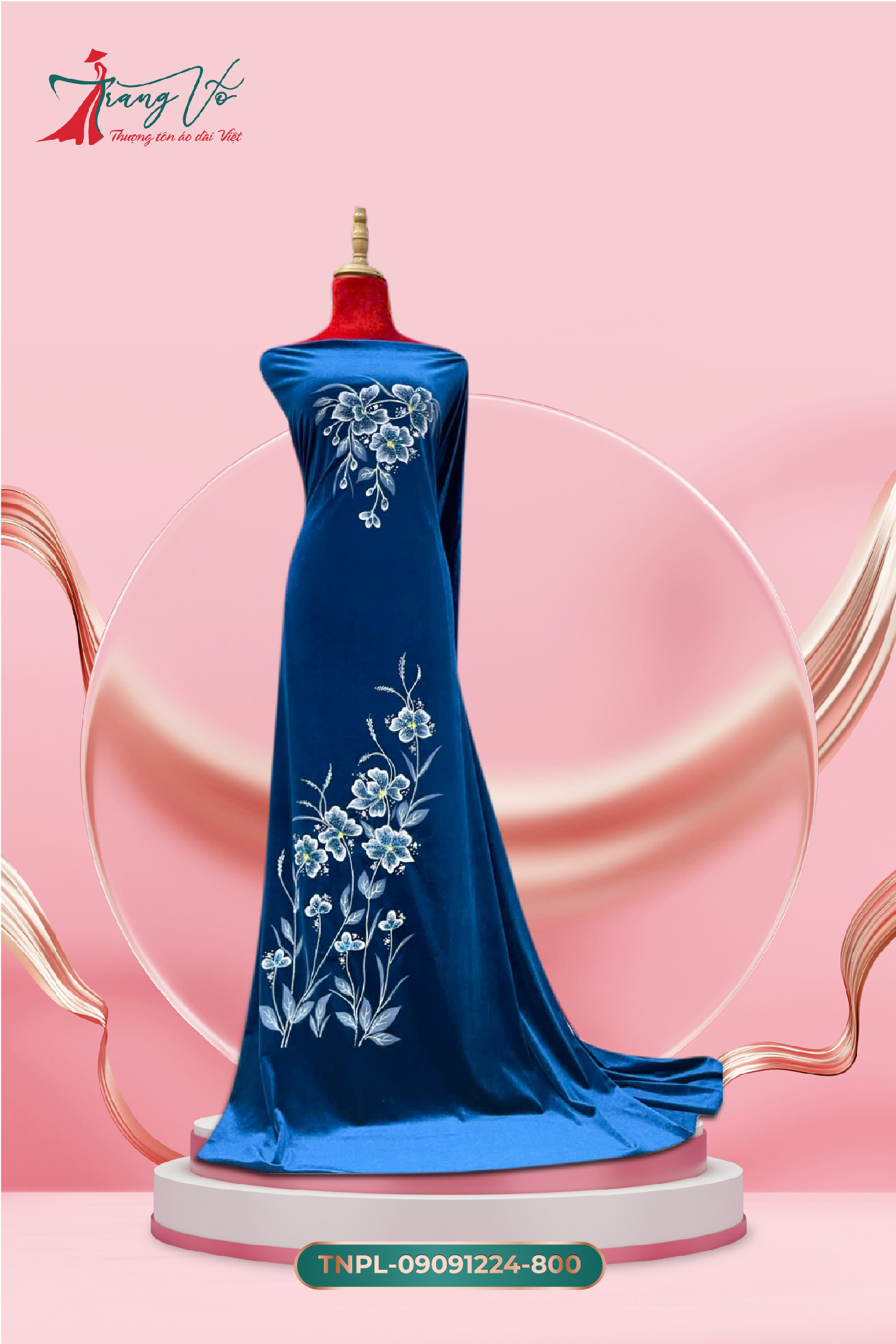 Áo dài được may từ vải nhung thun mềm mại, với họa tiết vẽ tinh xảo kết hợp cùng pha lê lấp lánh, mang đến vẻ đẹp sang trọng và quý phái