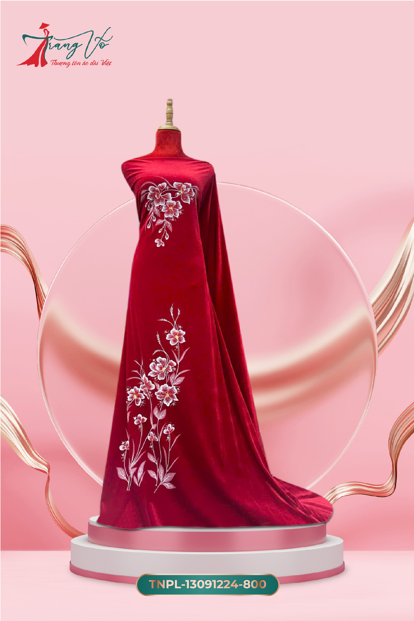 Họa tiết hoa được vẽ thủ công kết hợp với pha lê đính tỉ mỉ, tạo nên điểm nhấn lung linh trên nền vải đỏ. Sự kết hợp này không chỉ giúp áo dài thêm phần nổi bật mà còn thể hiện nét đẹp thanh thoát, quý phái.
