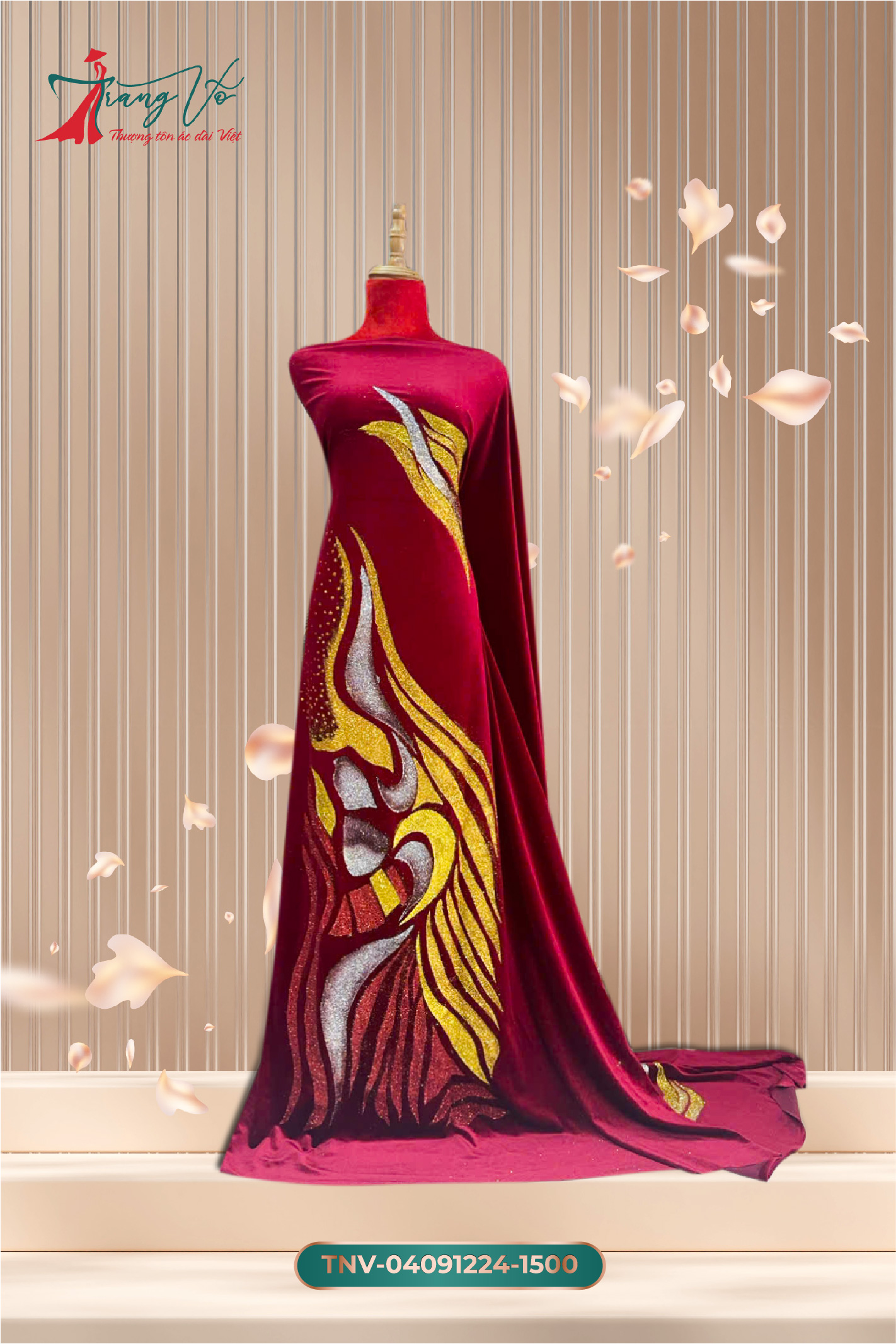 Áo dài được may từ vải nhung thun mềm mại, kết hợp với họa tiết vẽ tay nghệ thuật, tạo nên vẻ đẹp sang trọng và độc đáo. Họa tiết được điểm xuyết kim tuyến nhẹ, giúp trang phục thêm phần lấp lánh và thu hút.
