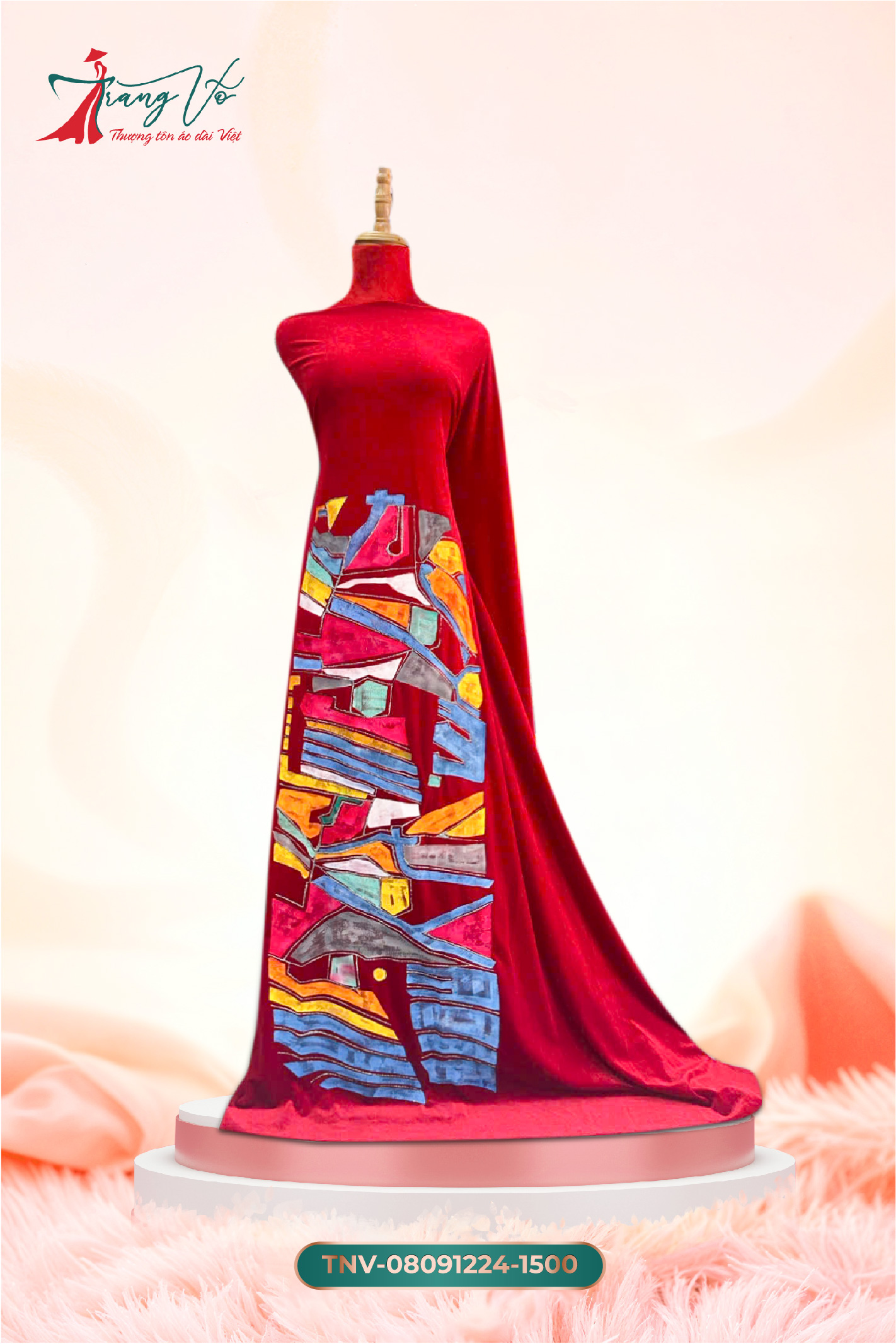 Áo dài được may từ vải nhung thun mềm mại, kết hợp với họa tiết vẽ tay nghệ thuật, tạo nên vẻ đẹp sang trọng và độc đáo. Họa tiết được điểm xuyết kim tuyến nhẹ, giúp trang phục thêm phần lấp lánh và thu hút.