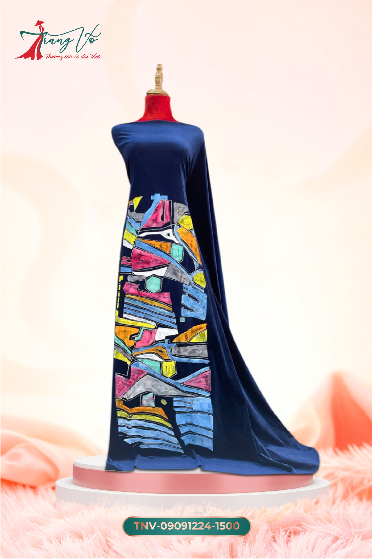Áo dài được may từ vải nhung thun mềm mại, kết hợp với họa tiết vẽ tay nghệ thuật, tạo nên vẻ đẹp sang trọng và độc đáo. Họa tiết được điểm xuyết kim tuyến nhẹ, giúp trang phục thêm phần lấp lánh và thu hút.