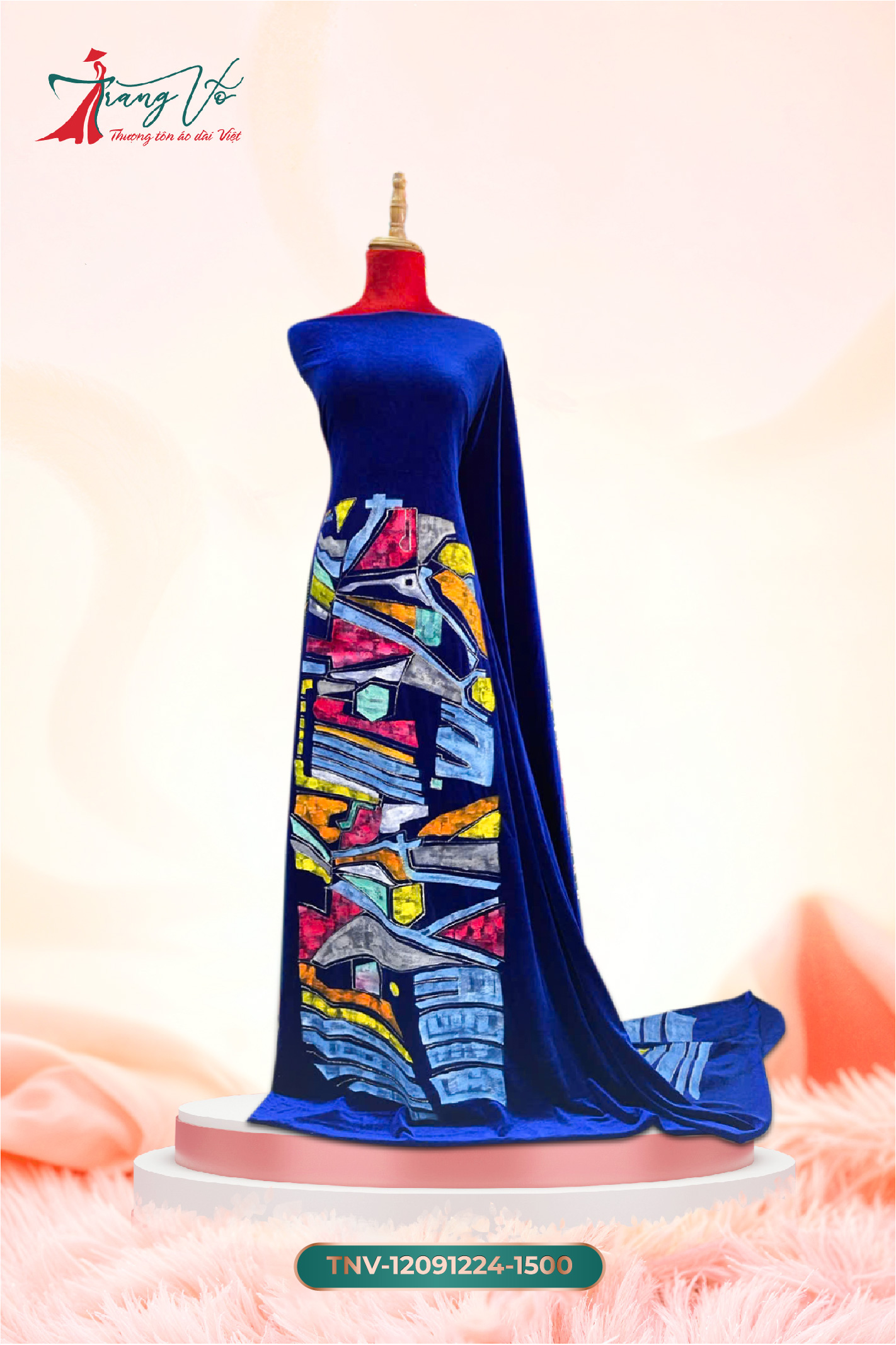 Áo dài được may từ vải nhung thun mềm mại, kết hợp với họa tiết vẽ tay nghệ thuật, tạo nên vẻ đẹp sang trọng và độc đáo. Họa tiết được điểm xuyết kim tuyến nhẹ, giúp trang phục thêm phần lấp lánh và thu hút.