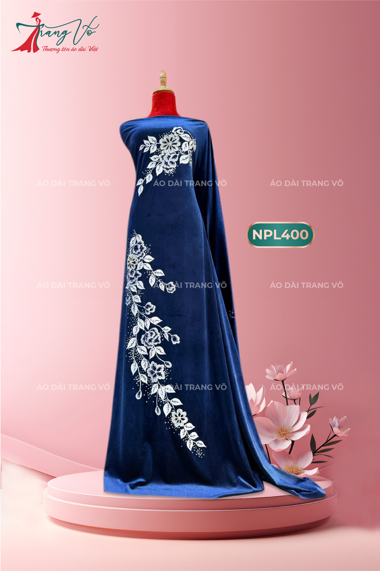 Áo dài được may từ vải nhung thun mềm mại, với họa tiết vẽ tinh xảo kết hợp cùng pha lê lấp lánh, mang đến vẻ đẹp sang trọng và quý phái